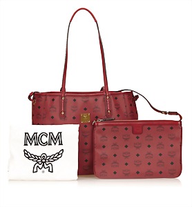 Shopper, bordeauxrot, Nappaleder mit MCM Monogramm, 2 Schultertrageriemen mit goldfarbenen Nieten, goldfarbene Beschläge, goldfarbene MCM Plakette mittig, Innenstoff mit goldfarbener Python-Optik und MCM Monogramm, 1 Fülltasche, B: 42 cm, H. ohne Henkel: 28 cm, T: 15 cm, passende herausnehmbare Innentasche mit goldfarbenem Reißverschluss, B: 28 cm, H: 19 cm, neuw. Zust., mit MCM-Card und Orig.-Staubbeutel