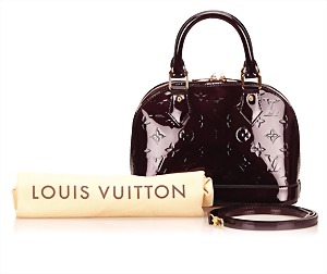 Handtasche, Modell: Alma Vernis BB Amarante, goldfarbene Beschläge, 2 Tragehenkel, 4 Füße, brombeerfarbener Innenstoff, 1 Fülltasche mit Reißverschluss, 1 Seitentasche mit Reißverschluss, Leder Emblem mit Louis Vuitton Schriftzug, Datacode: AA*1*3, 1 Schultertrageriemen, mit Schloss und 2 Schlüsseln, B: 23 cm, H. ohne Henkel: 20 cm, T: 10 cm, mit Orig.-Staubbeutel, neuw. Zust.