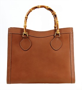 Handtasche, Serie: Bamboo, cognacfarbenes Leder, 2 Bamboo-Tragehenkel, 3 Fülltaschen mit Magnetverschluss, davon 1x mit Reißverschluss, 1 Seitentasche innen mit Reißverschluss, beiges Leder innen mit starken altersbed. Gebrauchsspuren, Leder-Emblem innen mit Gucci-Stempel und ID-Nr., 5 Füße, H. ohne Henkel: 28 cm, B: ca. 34 cm, T: ca. 15 cm, von außen nur leichte Gebrauchsspuren, sonst in gutem Zust., frühes Modell