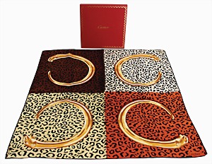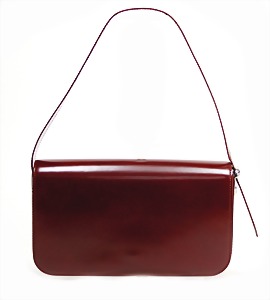 Handtasche, bordeauxrotes Leder, 1 größenverstellbarer Schulterhenkel, 1 Fülltasche mit Überschlag und Magnetverschluss, 2 Seitentaschen innen, davon 1x mit Reißverschluss und Leder-Emblem, beiger Innenstoff mit Animal-Print, H. ohne Henkel: 15 cm, B: ca. 26,5 cm, T: ca. 6,5 cm, mit Cartier Card, altersbed. leichte Gebrauchsspuren