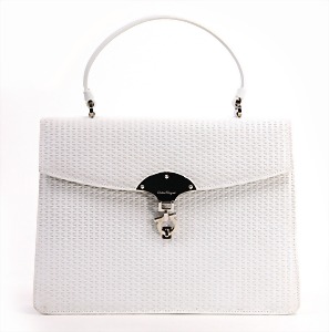 Handtasche, weißes geflochtenes Leder, 1 Tragehenkel, 3 Fülltaschen mit Überschlag und Schnappverschluss, 1x mit Reißverschluss, 1 Seitentasche mit Reißverschluss, blaues Wildleder innen, H. ohne Henkel: 21 cm, B: 28,5 cm, T: ca. 7 cm, sehr guter Zust.