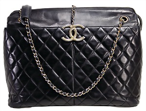 Handtasche, schwarzes abgestepptes Lammleder, 2 Kettentragehenkel, 1 Fülltasche mit Reißverschluss und CC-Logo Anhänger, schwarzes Leder innen, 2 Seitentaschen mit Reißverschluss innen mit CC-Logo Anhänger, H: 28 cm, B: 35 cm, T: 12 cm, altersbed. Gebrauchsspuren, sonst guter Zust.