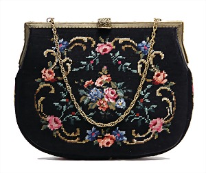 Handtasche, PetitPoint, goldfarbener Bügel, 1 Kettentrageriemen, 1 Fülltasche, 2 Seitentaschen innen, B: ca. 30 cm, H: ca. 25 cm, T: 4 cm, guter Zust.