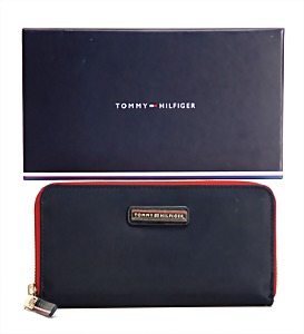 Portemonnaie, blauer Stoff, goldfarbene Plakette mit Tommy Hilfiger Prägung auf der Frontseite, 1 Münzgeldfach mit Reißverschluss, 3 Fülltaschen mit Reißverschluss, 12 Kartenfächer, 2 Scheinfächer, B: 19 cm, H: 10 cm, T: 2,5 cm, mit Orig.-Kart., guter Zust.