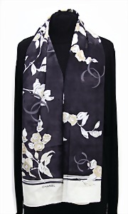 Seidenschal, L: 1,50 m., B: 42 cm, Blumenmotiv, schwarz, mit Chanel-Schriftzug, mit Pflege-Etikett, guter Zust.