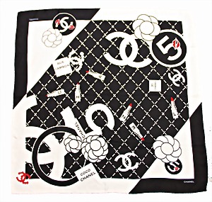 Seidenhalstuch, schwarz/weiß, handvernähter Rand, 86x86 cm, mit Chanel-Schriftzug und Pflege-Etikett