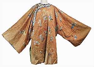 Asiatisches Gewand, 1850, Kimono, orangefarbene Seide, reichh. prunkvolle Goldstickerei, spielende Kinder-Motiv