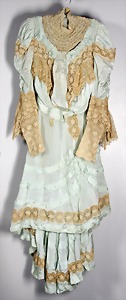 Damen-Outfit, ca. 1900, 1 feine Spitzenbluse, mit kl. Stickereien, Druckknopfleiste auf der Rückseite, kl. Stehkragen, sehr schöner Zust., dazu 1 Seiden-Oberteil, Minzfarbend, mit Spitzeneinsätzen, sehr schön verarbeitet, Hakenverschlüsse, sowie Fischgräten-Einsatz, mit Label: Ball & Dinner Dresses Friedrich Goringer, dazu passender Rock mit leichter Schleppe, fein verarbeitet, Seide teilw. verschlissen, 1 Unterkleid, mit reichh. Seideneinsatz, leicht ausgearbeitete Schleppe, Knopfleiste vorne, schönes Konv.