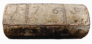 Kutschen-Truhe, 1765, mit Fell und Leder bezogen, teilw. mit Nieten verziert, Eisenbeschläge, B: 98 cm, H: 41 cm, T: 41 cm, innen mit floraler Tapete verziert, mit reichh. Stoffbahnen, teilw. aus der Zeit der Truhe, roter Samt, u.a. , Dachbodenfund, altersbed. verschlissen, Orig.-Zust.
