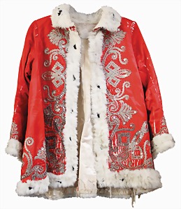 Frühe Kostüm-Jacke, um 1900, mit Nerz-Einsatz, sowie Brokat-Stickereien und Pailletten, rote Seide, teilw. verschlissen, beige Seide innen, stark verschlissen, evtl. Zirkus-Kleidung