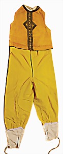 frühe Zirkus-Kleidung, um 1900, wohl für Clown, Übergroße Hose, gelb, Knopfleiste, dazu 1 Weste mit senffarbenem Samt sowie Brokat-Einsätzen, Knopfleiste, ausgefallen