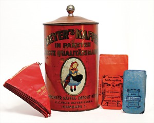 Kaffeedosen, Blech lithogr., Meyers Kaffee, Deckel mit Knauf, Aufschrift: In Paketen beste Qualitätsmarke Hamburger Kaffee-Import-Röstfrei Fritz Meyer GmbH, vereinzelte Druckstellen, sowie altersbed. Abriebstellen, H: 42 cm, Durchm: 24 cm, mit reichh. Papiertüten für frühen Kaufladen, spitze Papier-Tüten, für Tee oder Kakao, Aufschrift: Für Schokoladen-Laden, sowie ausgefallene Kakao-Tüten H. Brückmann, bitte besichtigen