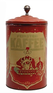 Kaffeedose, Blech lithogr., Feinster Kaffee, mit Knauf am Deckel, Durchm: 24 cm, bis auf kl. Stellen in sehr gutem Zust.