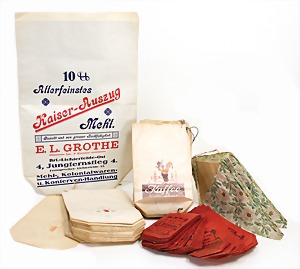 Konv. Dekorationsartikel für gr. Kaufladen, um 1900, Papiertüten, teilw. mit Weihnachtsmotiven, u.a. Spitzförmig, 1x Tüten: Kaffee frisch geröstet mit Mohr, sowie Kakao Brückmann, 2 versch. Gr., ausgefallenes Konv.