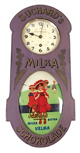 Wanduhr Milka Schokolade, mit Pendel und Schlüssel, bemaltes Glas, Suchard Milka Bittra Velma, H: 51 cm, B: 23 cm, T: 12 cm, vereinzelt altersbed. farbl. Abplatzstellen, unteres Glas gesprungen, sonst in gutem Zust.