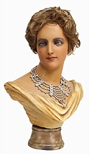 Damen-Büste, ca. 1935, Masse, mit Wachsschicht bemalt, altersbed. auf dem Brustkorb leichte Rissbildung, eingesetzte Glasaugen, Wimpern und Augenbrauen, Echthaar-Perücke, Kopf seitl. geneigt, sehr lebensecht ausmodell., H: 58 cm, B: 34 cm, mit Straßstein Collier, früher Haarkamm, Wachstuch um die Schultern, ausgefallen