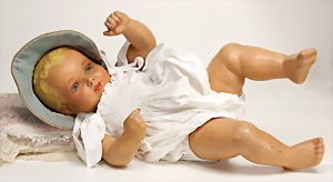 Schaufensterpuppe, Baby, Masse, bewegl. Arme, Liegeposition, eingesetzte blaue Glasaugen, geschl. Mund, ausmodell. blonde Haare, L: 56 cm, schöner Ausdruck