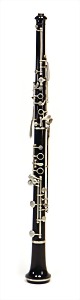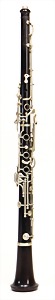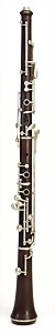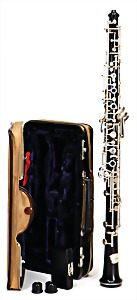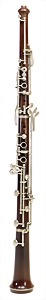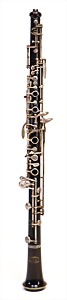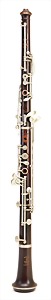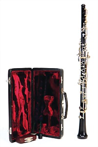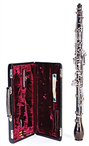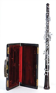 Oboe d´amore aus Grenadill, gebaut 1990, Conservatoire System, Ringklappen, vollautomatisch, Serien Nr. 849/3, mit S-Bogen, in schwarzem Etui mit violettem Samt, Holz Zust. 1, Mechanik Zust. 2 #769#