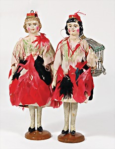 2 Puppenstubenpuppen (Theaterpuppen), Vogelhändler, gegliederter Holzkörper, Massekopf, 14,5 cm, ca. 1880, schöne Orig.-Kleidung
