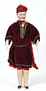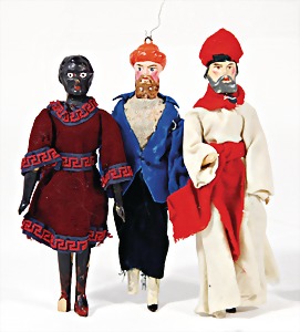 3 Puppenstubenpuppen (Theaterpuppen), Zauberer, Orientale, Mohr, 15 cm, Massekopf, gegliederte Holzkörper, 1 Fußspitze weggebrochen, 1 Fuß fehlt, 1 Hand weggebrochen, ca. 1880