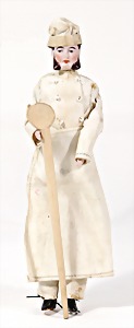 Puppenstubenpuppe, Koch, 16 cm, ca. 1890, Biskuit-Brustblattkopf, außergew. Backenbart, Biskuitarme u. –beine, Stoffkörper, schöne Orig.-Kleidung