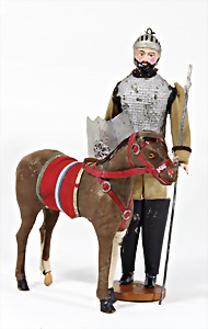 Puppenstubenpuppe, Theaterpuppe, Soldat, 16,5 cm, gegliederter Holzkörper, 1 Scharnier etwas lose, Massekopf, außergew. Orig.-Kleidung, ca. 1880, dazu 1 kl. Fellpferd, H: 12,5 cm, aus der Zeit