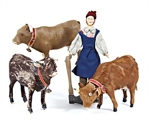 Puppenstubenpuppe, Bauer (Theaterpuppe), ca. 1880, 17 cm, gegliederter Holzkörper, Massekopf, dazu 2 Kühe, 1 Ochse, Holz/Masse, fellbezogen, aus der Zeit, ausgefallen, Ochse an der Schnauze etwas bestoßen, Orig.-Zust.