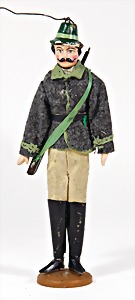 Puppenstubenpuppe (Theaterpuppe), ca. 1880, Jäger, 17,5 cm, gegliederter Holzkörper, Massekopf, schöne Orig.-Kleidung, Holzgewehr, Hutrand etwas bestoßen, sonst schöner Orig.-Zust.