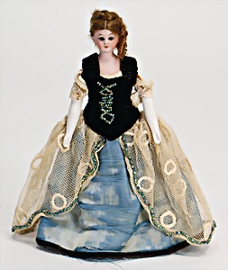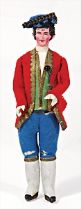 Puppenstubenpuppe (Theaterpuppe), Edelmann, 15 cm, gegliederter Holzkörper, Massekopf, schöne Orig.-Kleidung, an ein paar Stellen altersbed. verschlissen, ca. 1880