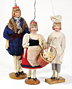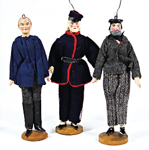 3 Puppenstubenpuppen (Theaterpuppen), 17 cm, 17,5 cm, gegliederte Holzkörper, Massekopf, Orig.-Kleidung, mit Holzsockel