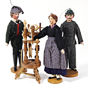 3 Puppenstubenpuppen (Theaterpuppen), 15 cm, Massekopf, gegliederte Holzkörper, alte Kleidung, ca. 1880, dazu 1 Spinnrad, 13,5 cm, Holz