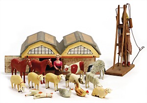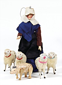Puppenstubenpuppe (Theaterpuppe), 17 cm, Magd, Massekopf, gegliederter Holzkörper, ca. 1880, 4 Masse-Fellschafe, dazu 1 Schwein, Beine ergänzt