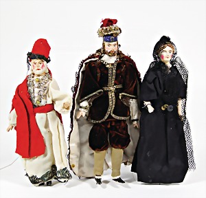 3 Puppenstubenpuppen (Theaterpuppen), Edelmänner, 1 Frau, 14,5 – 17cm, Masseköpfe, gegliederte Holzkörper, ca. 1880, alte Kleidung
