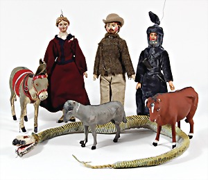 3 Puppenstubenpuppen (Theaterpuppen), 13,5 – 15 cm, Masseköpfe, gegliederte Holzkörper, 1 Fuß lose, dazu 1 Papier-Schlange mit Massekopf, 3 Masse-Tiere, davon 1 Tier beschädigt
