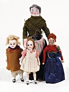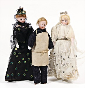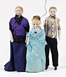 3 Puppenstubenpuppen, Biskuitporzellan–Brustblattköpfe, –Arme u. –Beine, Stoffkörper, 1x Glasaugen, 2x gemalte Augen, 1 Puppe Füße weggebrochen, alte Kleidung