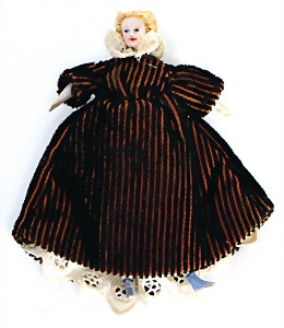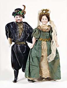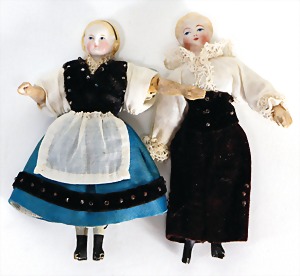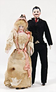 2 Puppenstubenpuppen, Mann, 18 cm, Biskuit-Brustblattkopf, modell. Schnurrbart, Biskuitarme u. –beine, Stoffkörper, Dame, 15 cm, Biskuit-Brustblattkopf, Arme u. Beine, gemalte Augen, Perücke