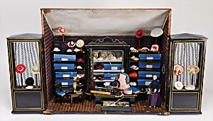 Modeladen, Biedermeier, B: 57 cm, H: 47,5 cm, Holz mit lithogr. Papier beklebt, 2 Regale, 1 Vitrine mittig, Mittelvitrine 1 Seitenlasche fehlt, mit Orig.-Pappschachteln, seitl. 2 Schaufenster, Orig.-Theke, reichh. Zubehör aus der Zeit, darunter 56 Hüte, einige Hutständer, Stoffe, Möbel, Zubehör, 1 Puppenstubenpuppe, unberührter Dachbodenfund aus herrschaftl. Haushalt