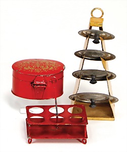 3-tlg. Ausschmückungsteile für Puppenküche, Flaschenhalter, Blech, rot lackiert, 1 Strebe lose, kl. Brotdose, Blech lithogr., Märklin, 1 Tellerhalter 1 Knauf fehlt