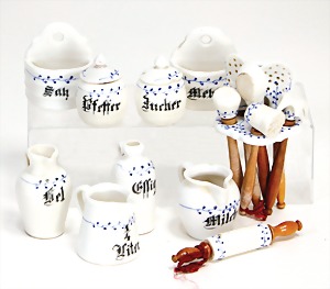 Puppenküchenporzellan, weiß mit blauem Dekor, schwarze Schrift, f. kl. bis mittlere Küche, Ölkaraffe, 5 cm, Essigkaraffe, Milchkaraffe, Karaffe ¼ l, Wandhalter, 2 Gewürzdosen, Salz- u. Mehlmetze, Nudelrolle, bis auf kl. Abplatzer am Rand guter Zust.