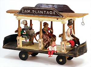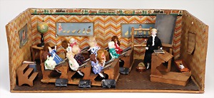 kl. Puppenstubenschule, B: 57 cm, H: 20,5 cm, T: 35,5 cm, ca. 1910, schöne Orig.-Tapete, mit Automobilen, Fahrzeugen, Straßenbahn, Eisenbahn, oben am Rand, 12 Ganzbiskuit-Puppen, bis auf eine Glasaugen, bei 2 Puppen Beine 1x ergänzt, Lehrerin Biskuit-Brustblattkopf, -arme u. –beine, Stoffkörper, Lehrerpult, Schulbänke, Tafel, reichh. Zubehör, Dachbodenfund