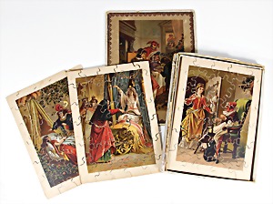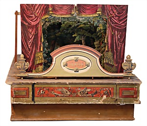 Papiertheater, B: 81 cm, Holz mit lithogr. Papier beklebt, sehr umfangreiche Kulissen u. Bühnenbilder, Zubehörteile, ca. 1890
