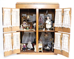 dekoratives Puppenhaus, Eigenbau aus altem kl. Hängeschrank, Wurzelholzfurnier, Fassade zum Öffnen, möbliert, sehr reichh. Zubehör, einige Zubehörteile neuer, viele Puppenstubenpuppen