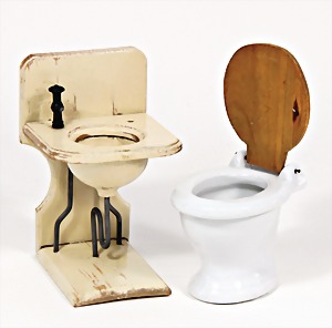 2-tlg., Ausschmückungsteile für Puppenstuben-Badezimmer, Waschbecken, Holz, H: 10,5 cm, 1 Hahn fehlt, 1 Hahn Griff weggebrochen, 1 Porzellan-Toilette