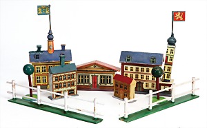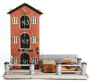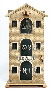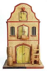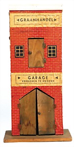 Packhaus, H: 71 cm, Holz, mit Backsteinmuster-Tapete beklebt, teilw. bemalt, bespielt, Orig.-Zust., altersbed. Tapete verschlissen