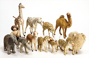 12-tlg., Papiermaché, fellüberzogene Wildtiere f. frühe Menagerieszene, 12 – 14 cm, meist sehr schöner Orig.-Zust., 2x Glasauge fehlt, ca. 1880, dazu 1 Wattefigur