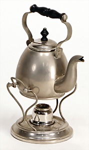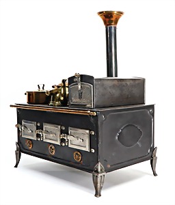 Außergew. Puppenküchenherd mit oben liegendem Backofen, B: 32 cm, Türen vernickelt, Topfsatz mit Wasserkessel, Kupfer, innen verzinnt, mit Brenner