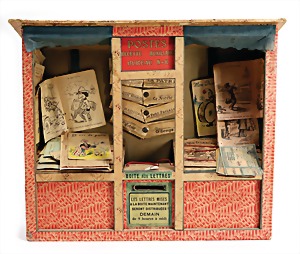 Zeitschriftenladen, Frankreich, um 1900, H: 36 cm, Holz Presspappe, mit lithogr. Papier beklebt, Orig.-Zubehör