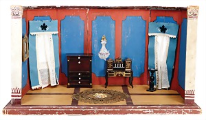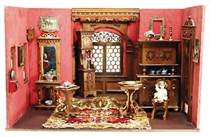 Laubsägearbeit, Wohnzimmer, B: 66 cm, H: 43 cm, T: 44 cm, teilw. Wand vertäfelt, 1 Facette an der Ausgangstür seitl. unten fehlt, möbliert, mit Zubehör