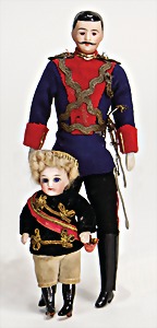 Puppenstubenpuppe, Soldat, 17 cm, angezogen als Theaterpuppe, Biskuit-Brustblattkopf, modell. Schnurrbart, gemalte Augen, Biskuitarme u. –beine, Stoffkörper, Orig.-Kleidung, Seidenumhang verschlissen, sonst schöner Orig.-Zust.