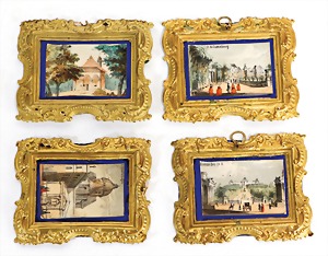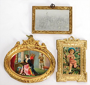 Konv. Messing/Blech vergoldet, 2 Puppenstuben-Bilder, H: 7,5 cm, dazu 1 Spiegel
